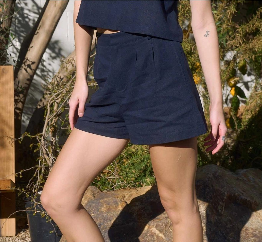 High Waist Front Pleat Linen Blend Shorts - Navy