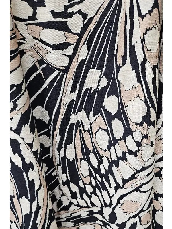 This printed maxi dress features convenient side pockets, an open back secured with a tie, a discreet back zipper, and a fully lined interior for comfort and structure.