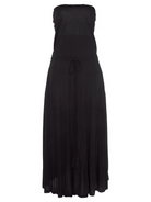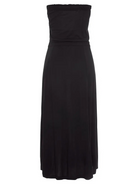 This strapless midi dress offers a blend of casual charm and refined style. Featuring an elastic neckline and waistband for a comfortable fit, it includes a functional drawstring adorned with tassels. Crafted from soft jersey knit, the dress showcases an A-line silhouette with side slit pockets for added practicality.