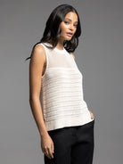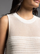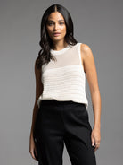 This ivory knit sleeveless top features a classic crew neckline and practical side vents for added comfort and movement. Crafted with expert attention to detail, it offers a refined silhouette ideal for layering or wearing solo in warmer weather. Its versatile design combines timeless style with breathable knit fabric, making it a staple piece in any wardrobe.