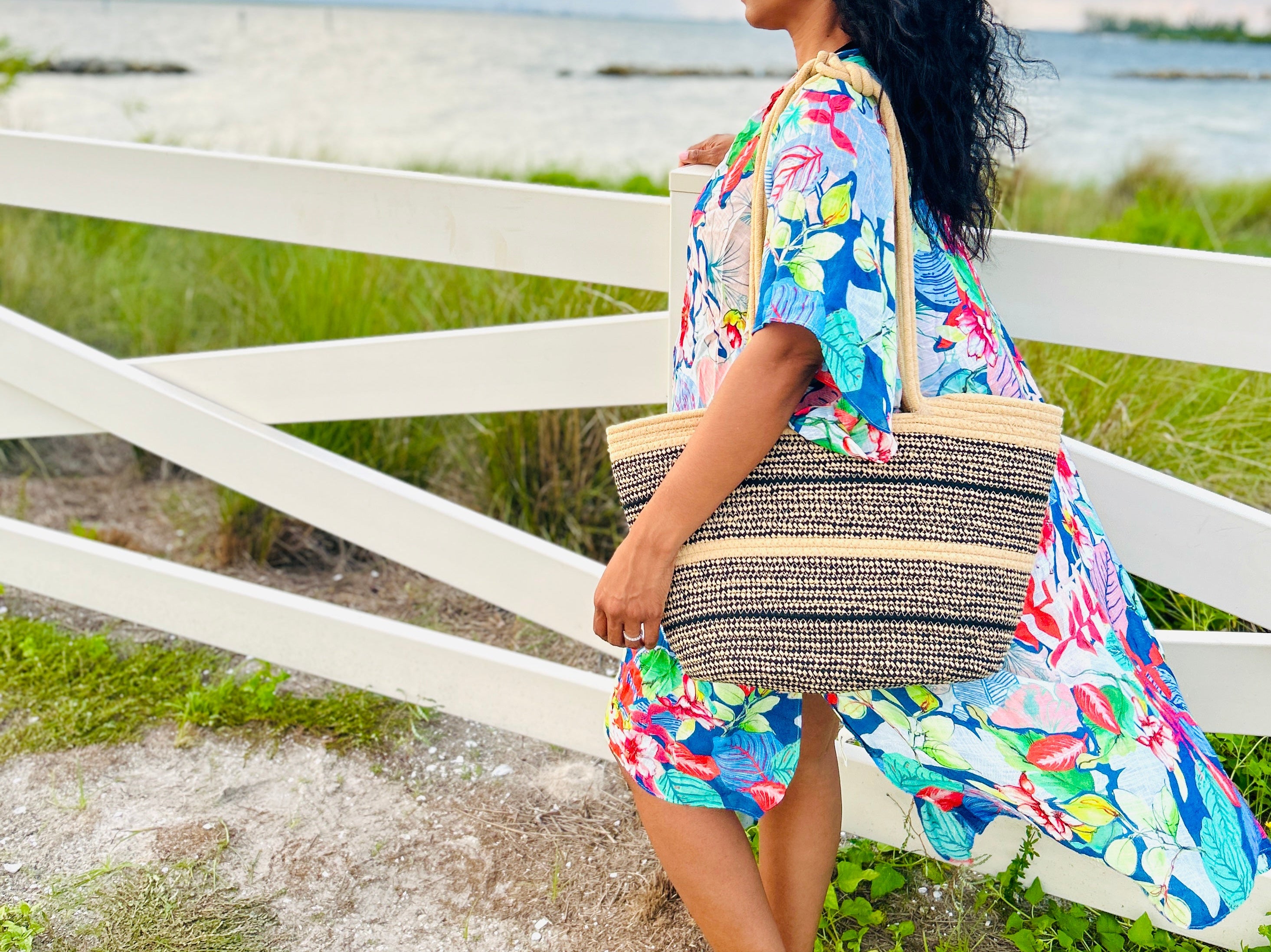 100% Cotton Woven Tote, designed with a chic two-tone color pattern and twist detail knot handle shoulder straps. This stylish and functional bag is perfect for beach days, casual outings, or as your everyday go-to tote. This tote features a soft yet durable woven texture with a unique two-tone color pattern.